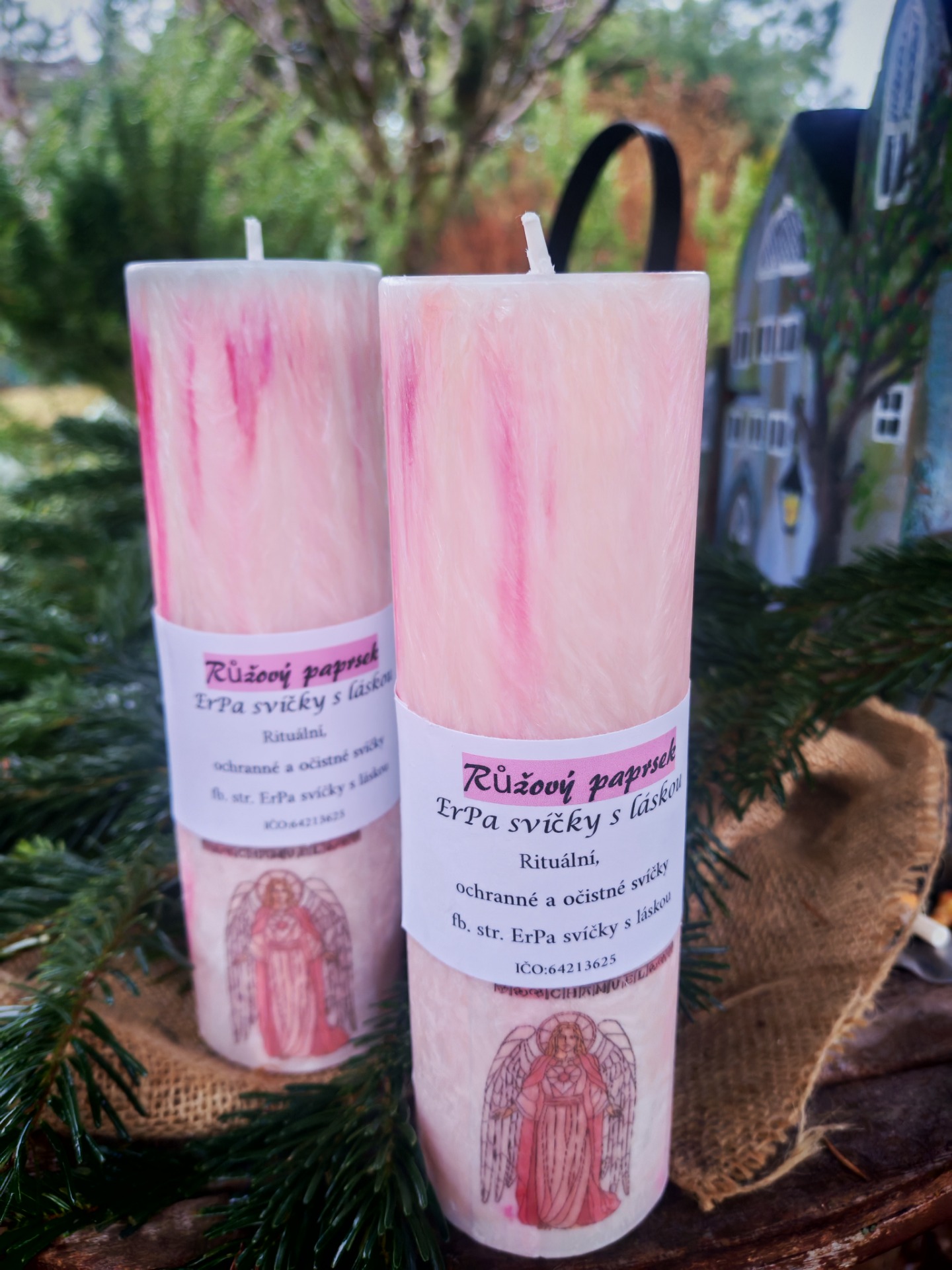 Růžová: navozuje romantickou atmosféru, nezapálená u vchodových dveří vnáší lásku. Magicky působí v rituálech lásky, čisté a jemné krásy, přátelství, harmonie, manželství, milostných vztahů, mladí, romantiky a relaxace . Růžová je barvou štěstí. Zapalujeme v průběhu rituálů zaměřených na sebepřijetí a zvýšení lásky k sami k sobě...