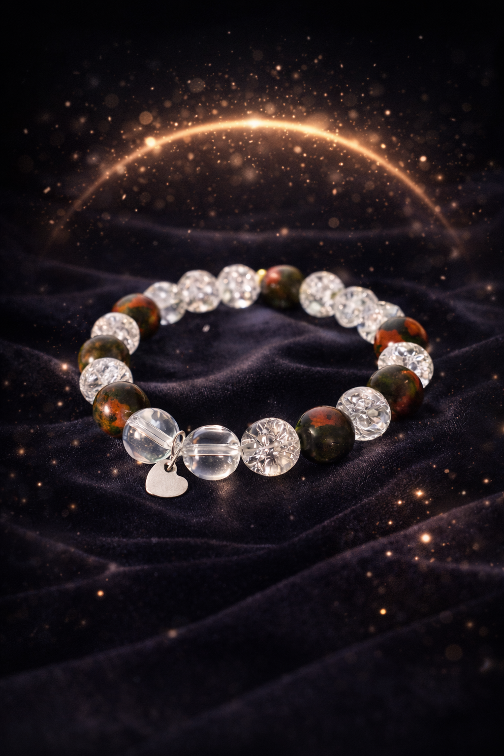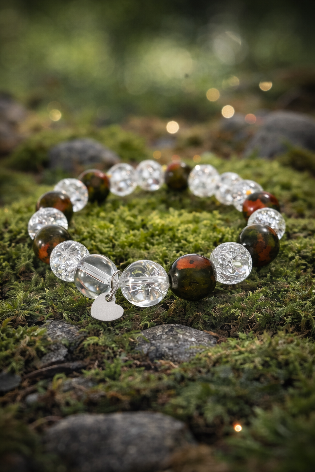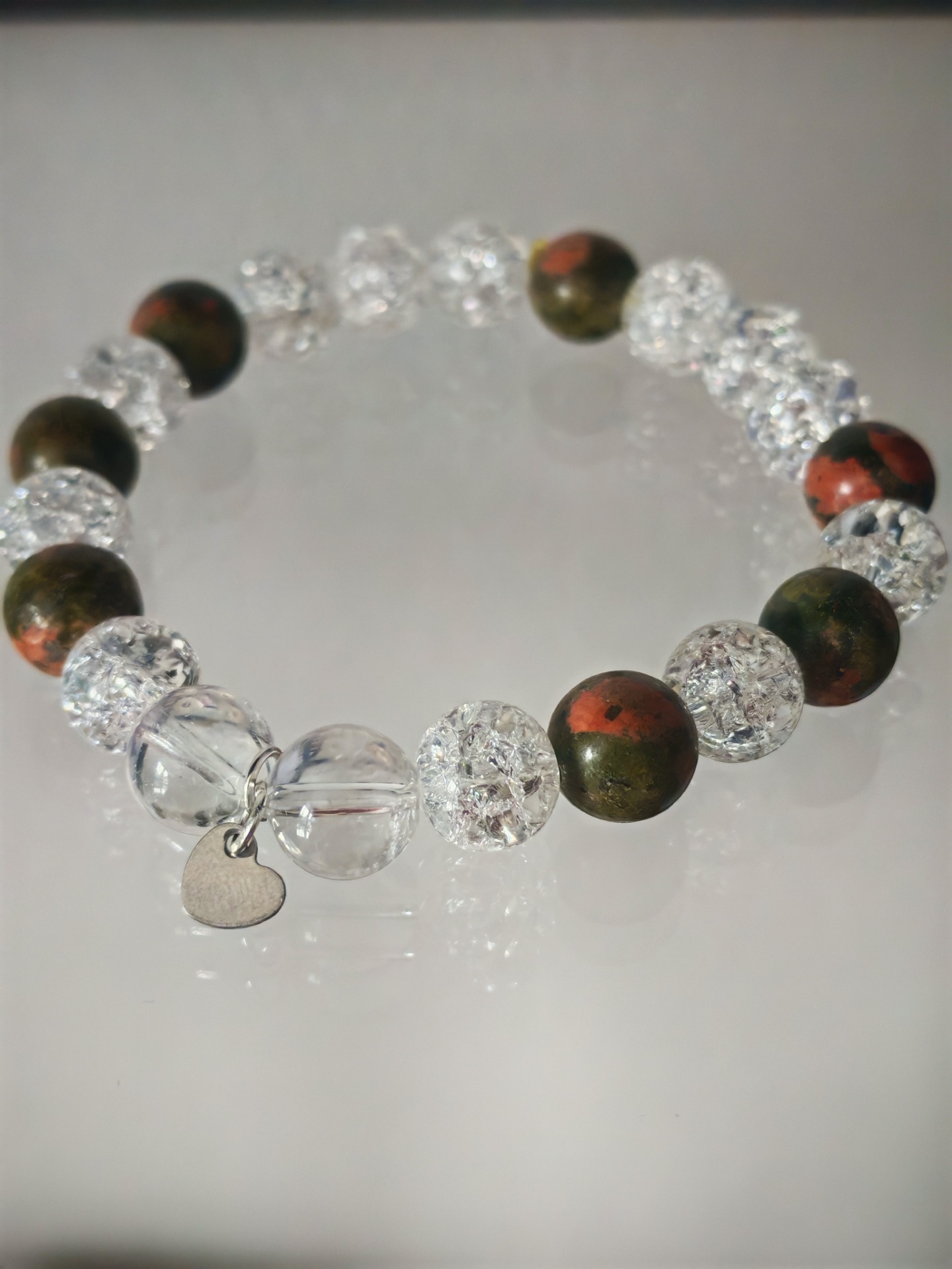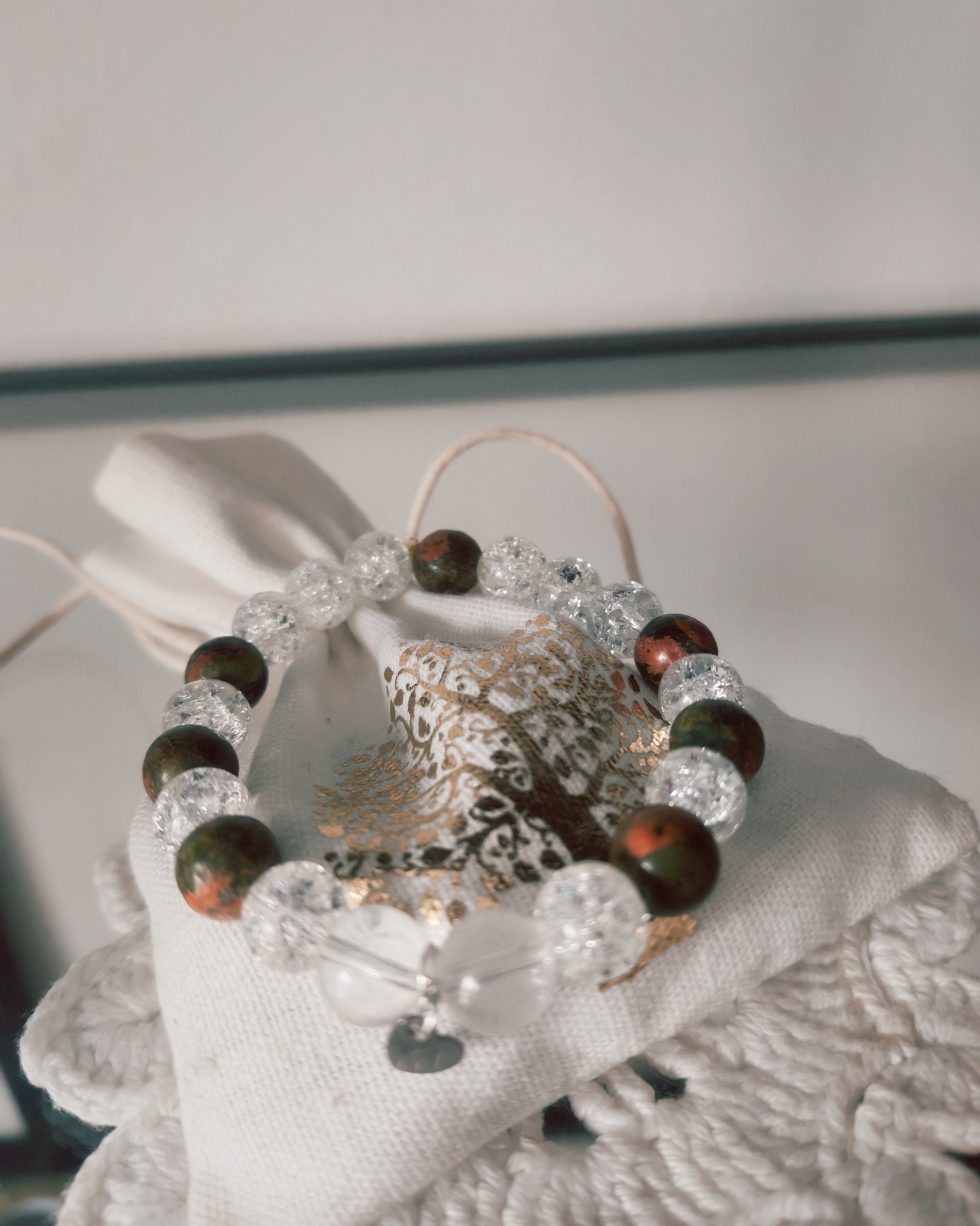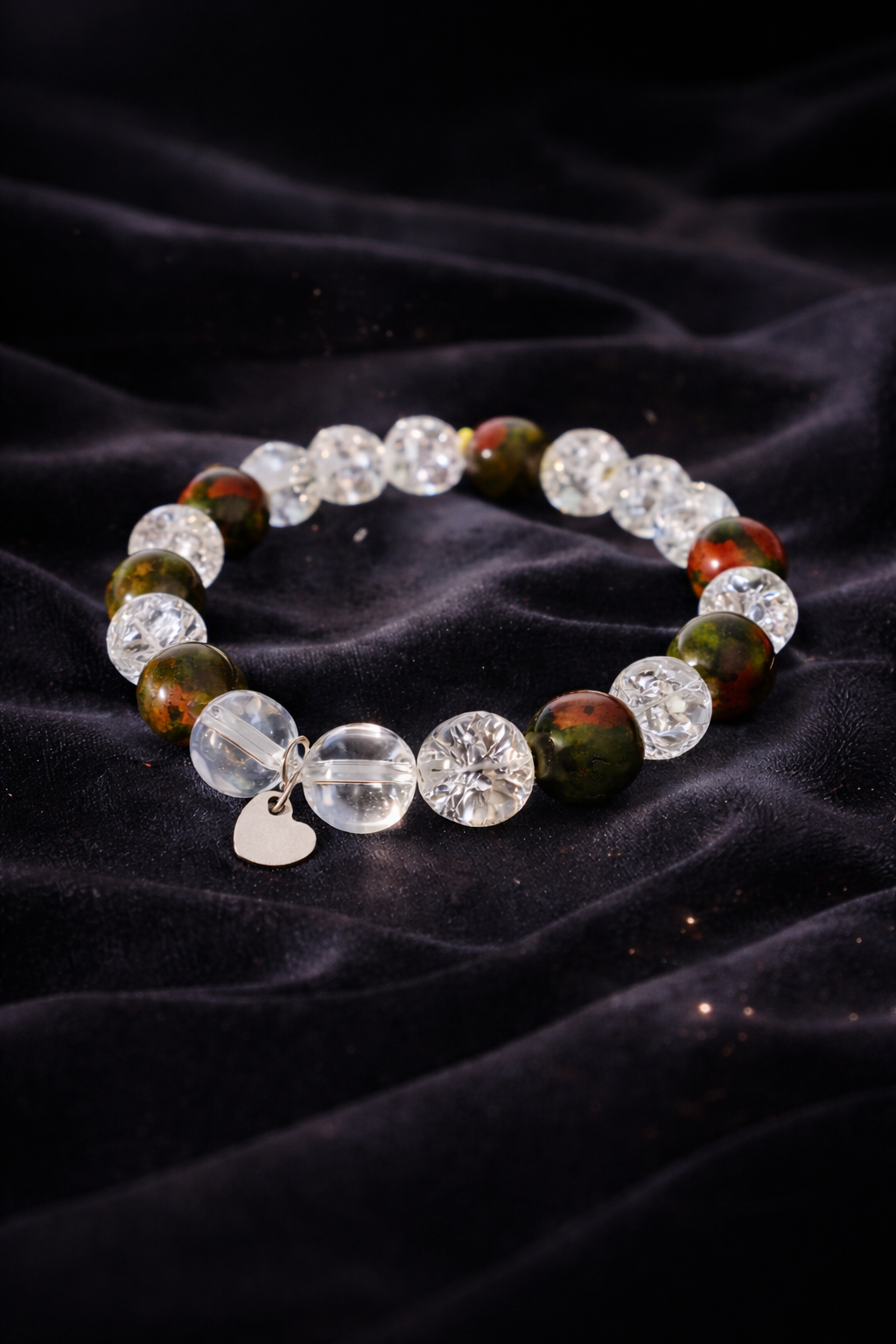Minerální náramek Harmonie srdce spojuje jemnou energii unakitu s čistotou křišťálu. Tato kombinace je symbolem rovnováhy, emoční stability a otevřeného srdce.
