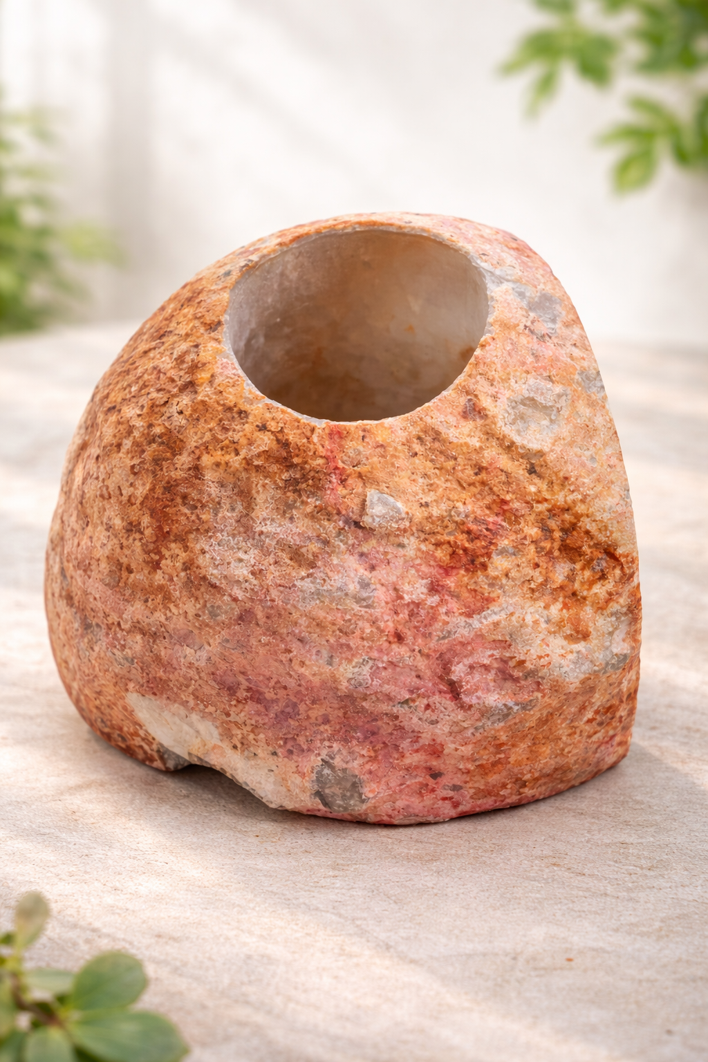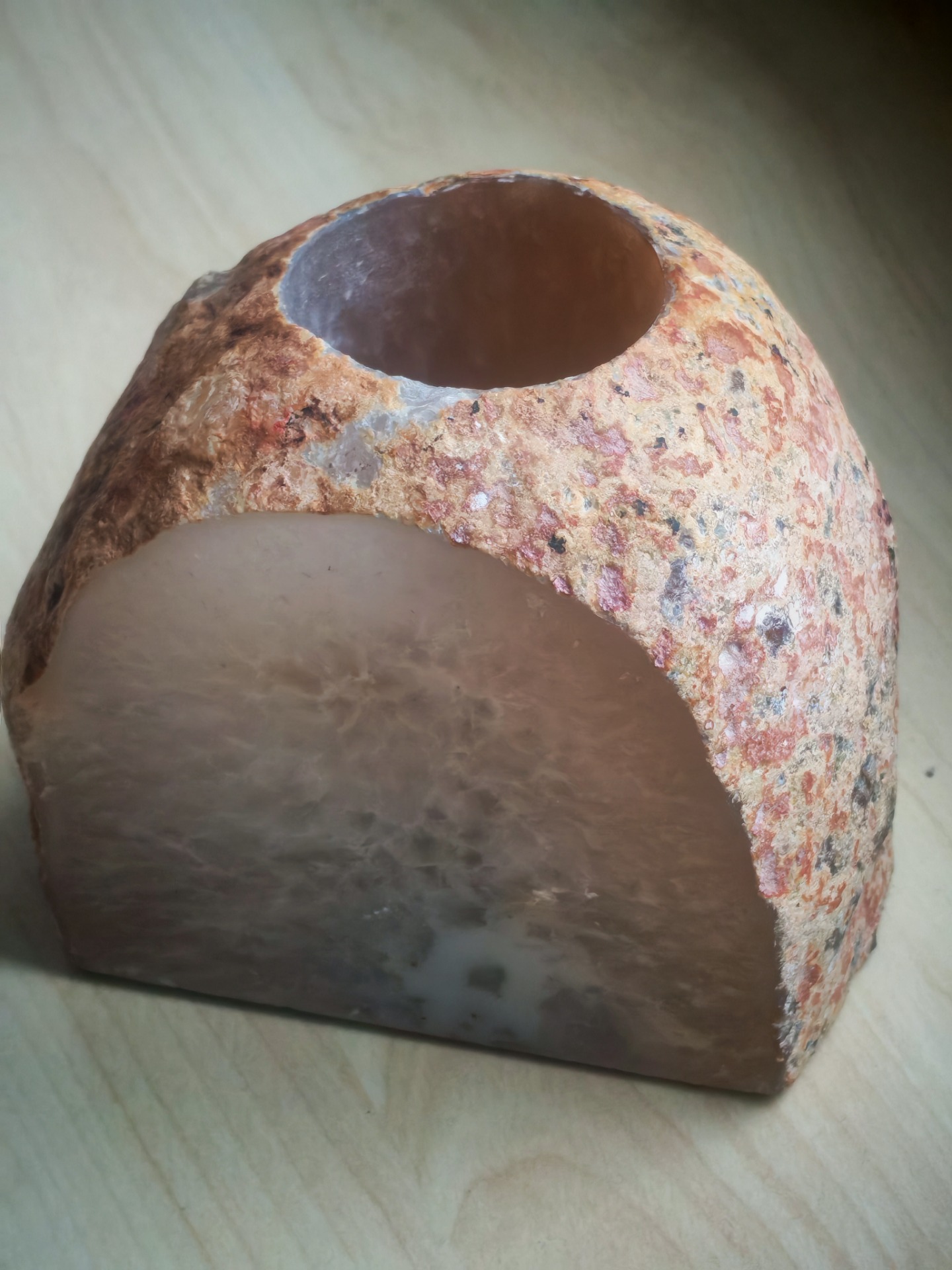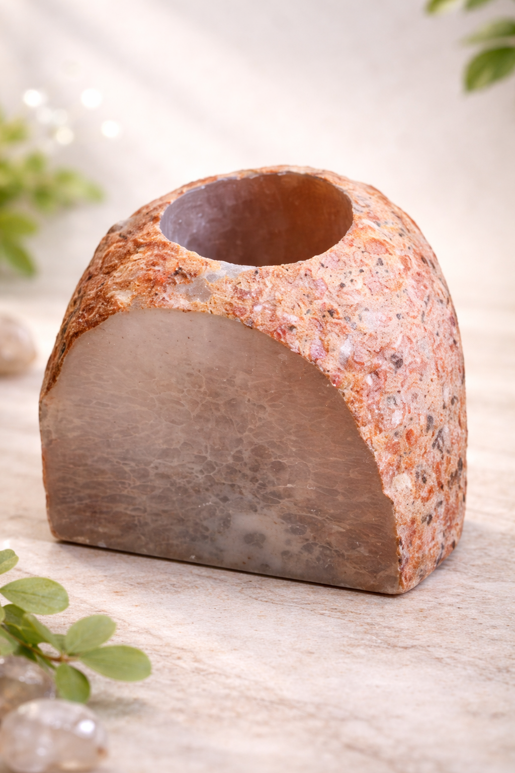Přírodní Svícen z Achátu je jedinečný doplněk do interiéru, který v sobě spojuje krásu minerálu a funkční design. Svícen je vyrobený z řezu autentického achátového kamene, který se vyznačuje svou jedinečnou kresbou a barevnými vrstvami, díky čemuž je naprostým originálem. Achát je oblíbený minerál spojovaný s klidem, rovnováhou a ochranou. Kamenný svícen z achátu tak není jen estetickým prvkem, ale i dekorací s hlubším významem. Skvěle zapadne do přírodních, boho, minimalistických i moderních interiérů. Achátový svícen vytváří při zapálení svíčky teplé, uklidňující světlo a přispívá k harmonické atmosféře domova. Je ideální jako dekorace do obývacího pokoje, ložnice, pracovny i wellness prostoru. Původ Brazílie, top kvalita.