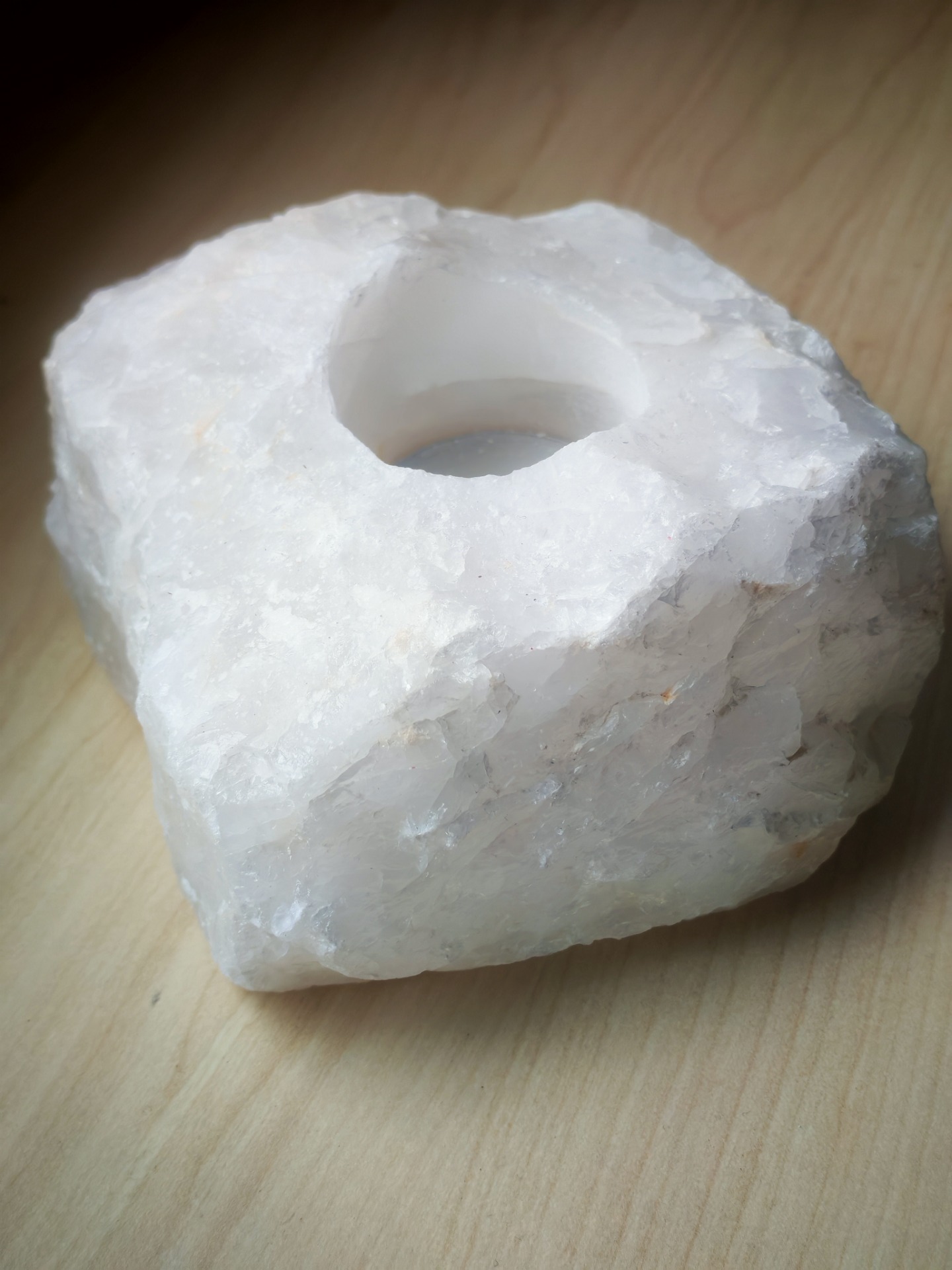 Svícen na čajovou svíčku z ručně opracovaného surového křišťálu. Země původu: Brazílie.